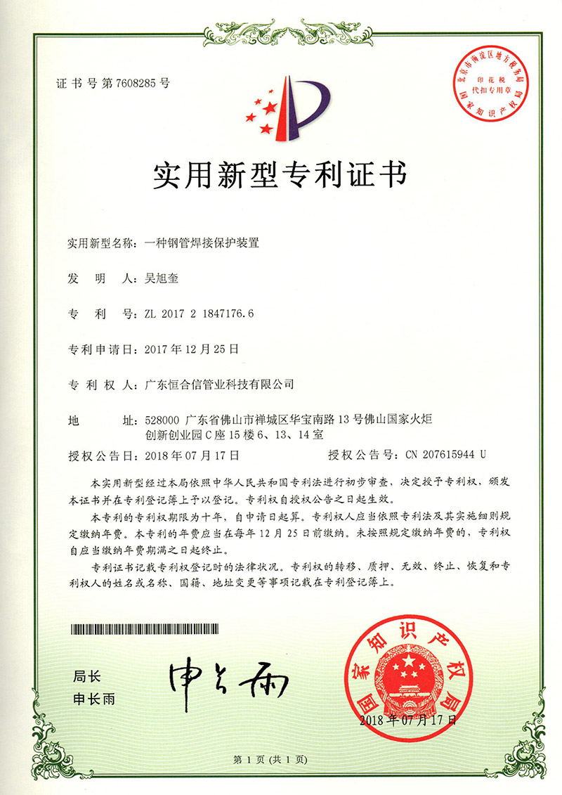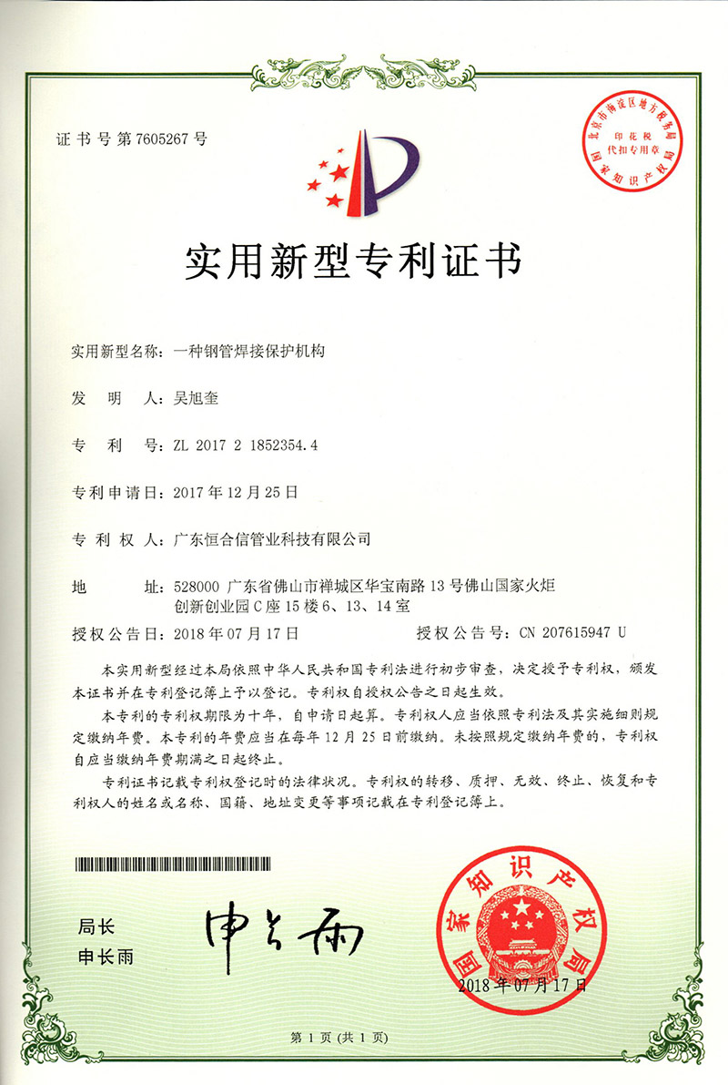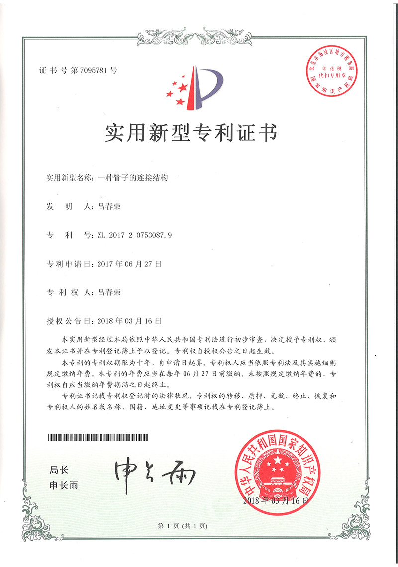 一種管子的連接結構專利證書