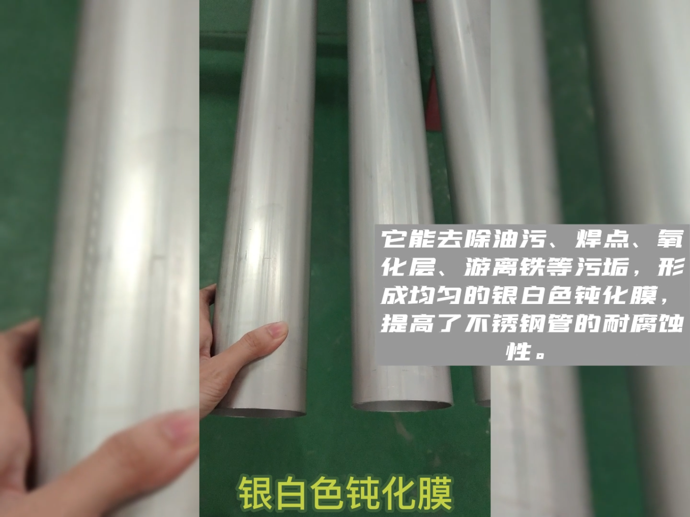 它能去除油污、焊點、氧化層、游離鐵等污垢,形成均勻的銀白色鈍化膜,提高了不銹鋼管的耐腐蝕性。