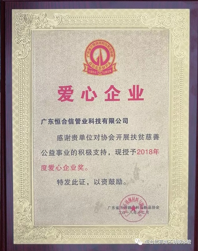 恒合信管業(yè)獲得“2018年度愛心企業(yè)”獎項
