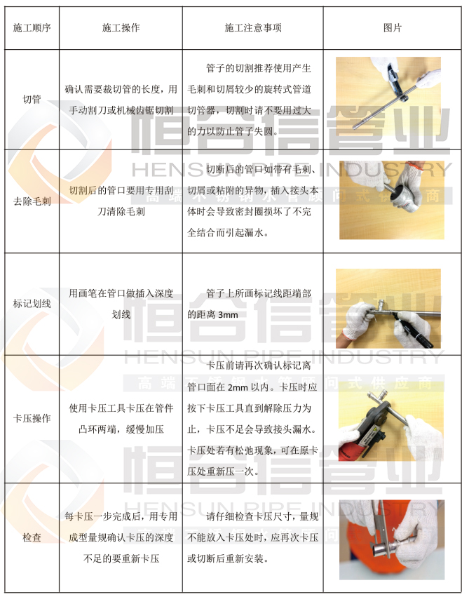 不銹鋼雙卡壓管件連接的施工安裝過程如下: